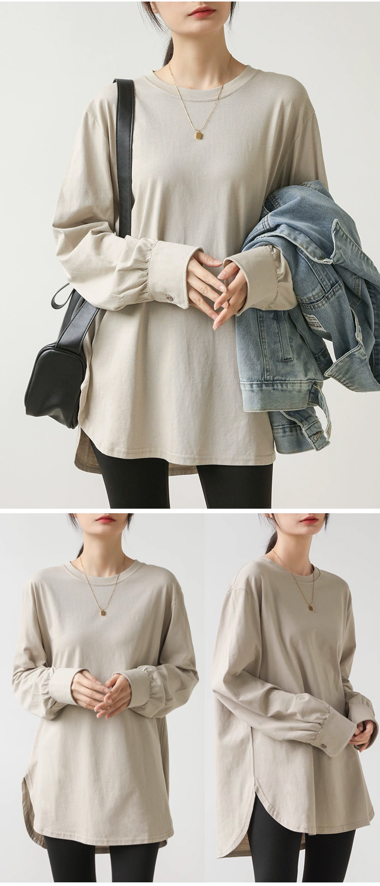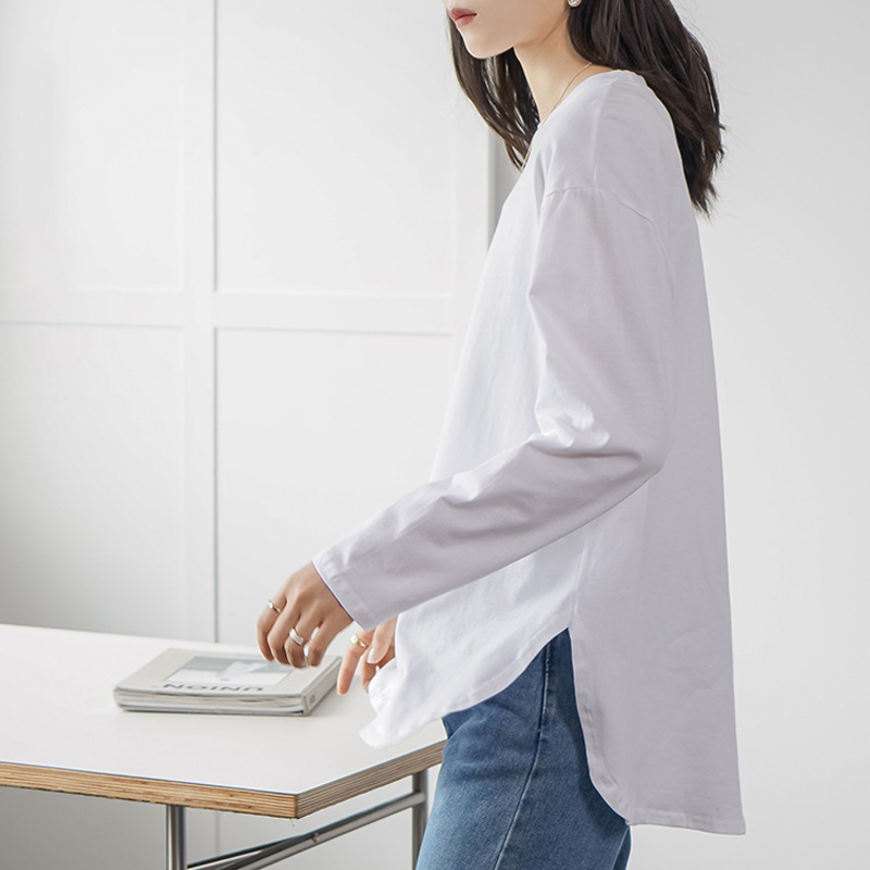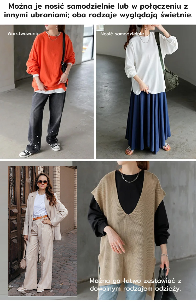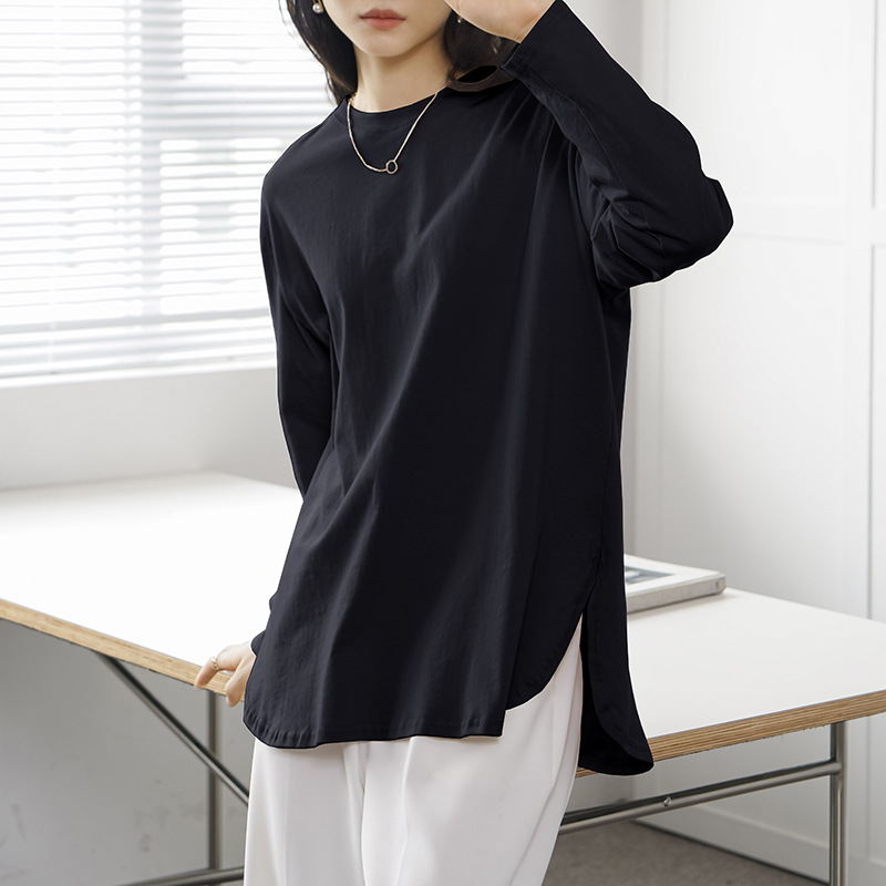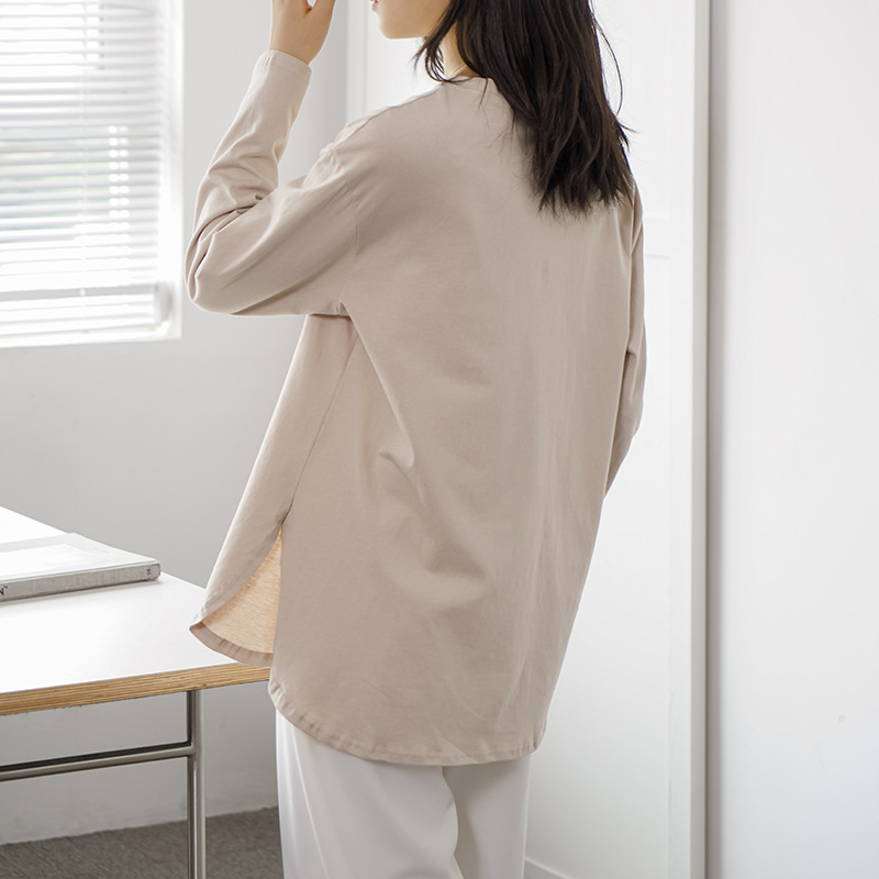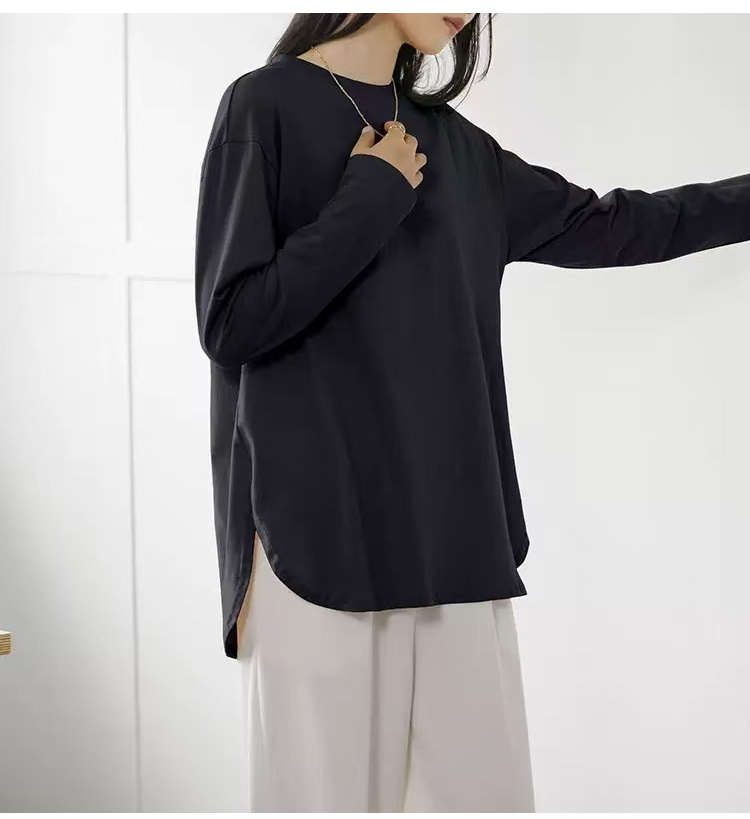 Luźny, swobodny, jednolity kolor, okrągły dekolt, długi rękaw