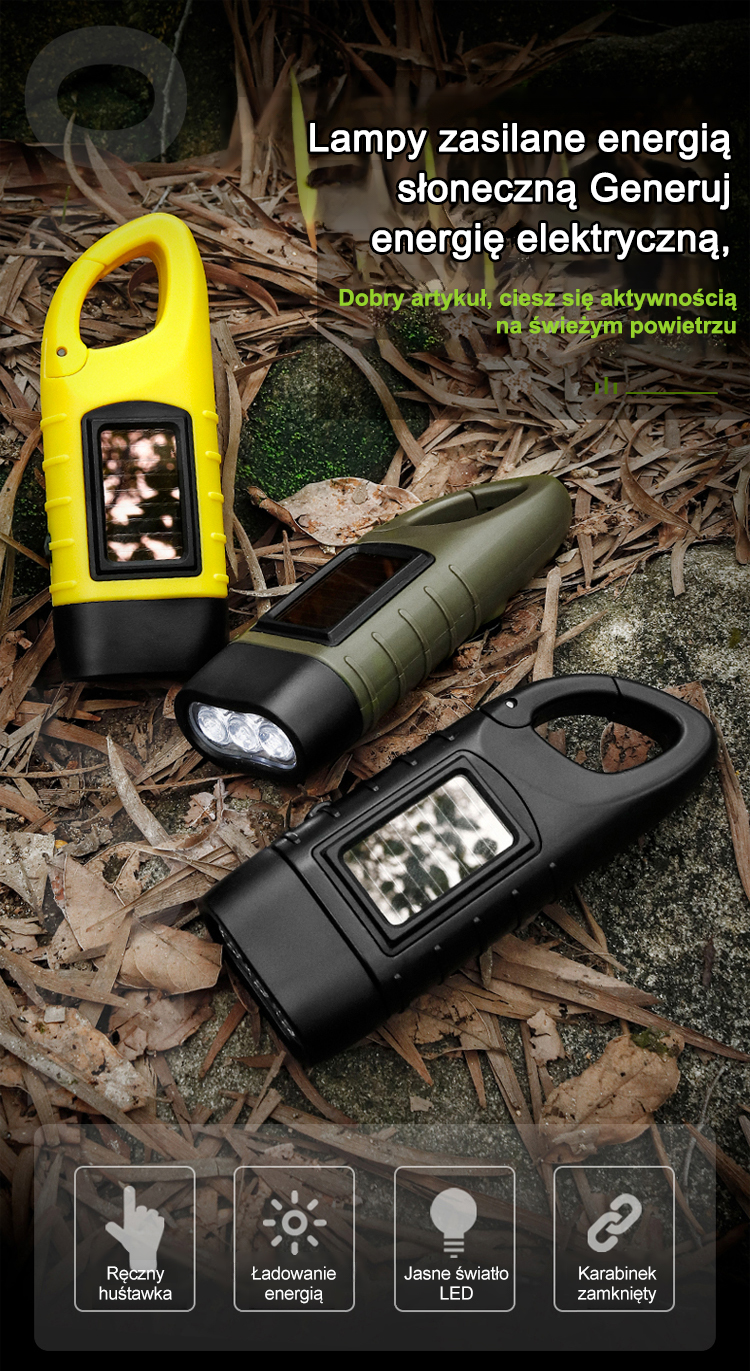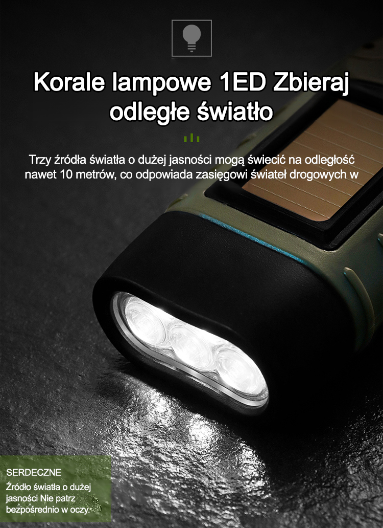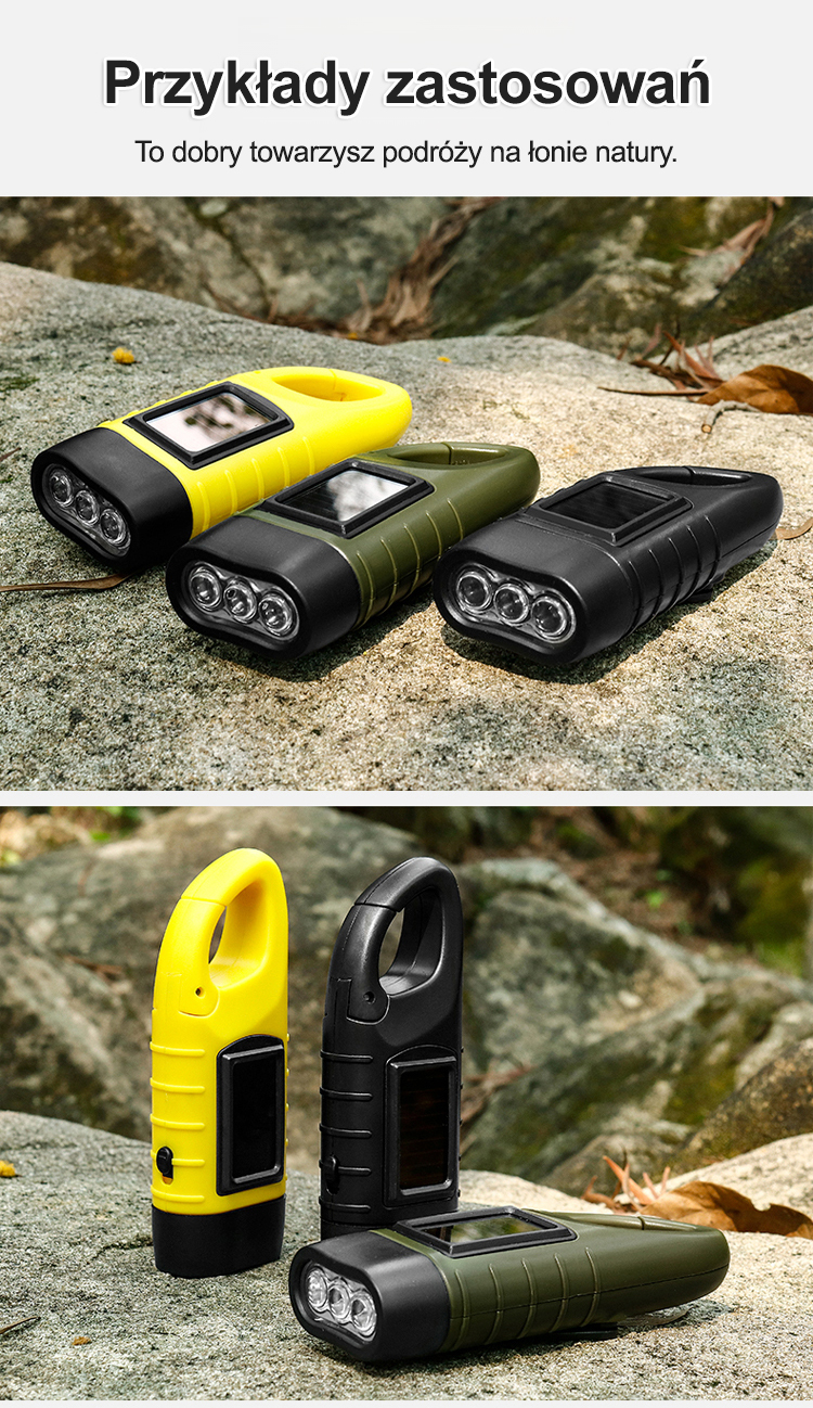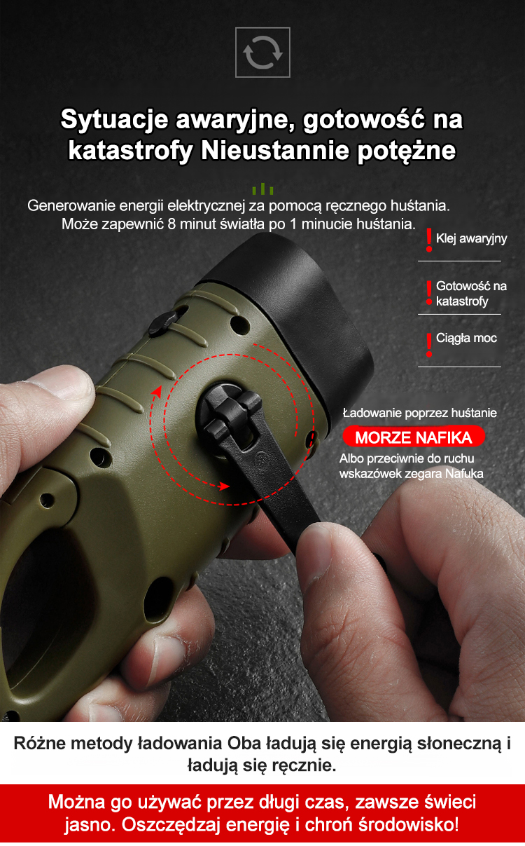 Niezawodna latarka ratunkowa z funkcją powerbanku. Świeci na odległość 500 m i oferuje 3 sposoby ładowania: słońcem, korbą lub kablem. Wykonana z wytrzymałego tworzywa ABS, przetrwa deszcz, mróz i upadki. Niezbędna w każdym domu i plecaku ucieczkowym.