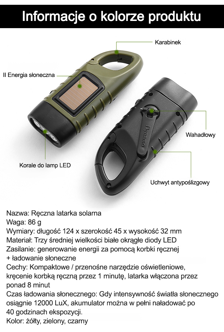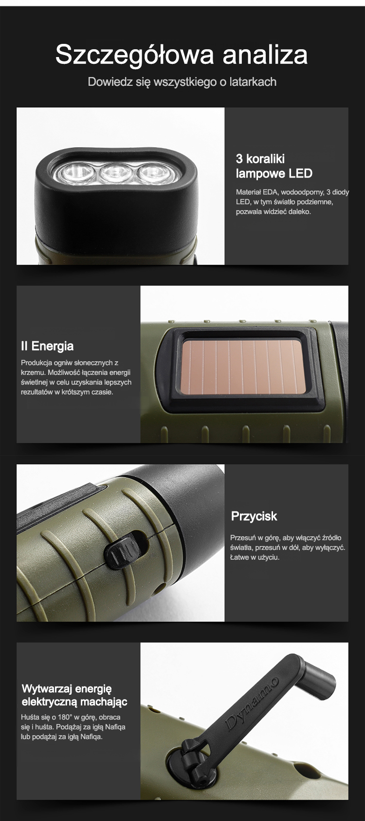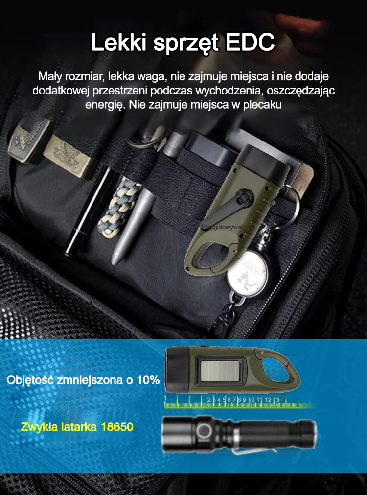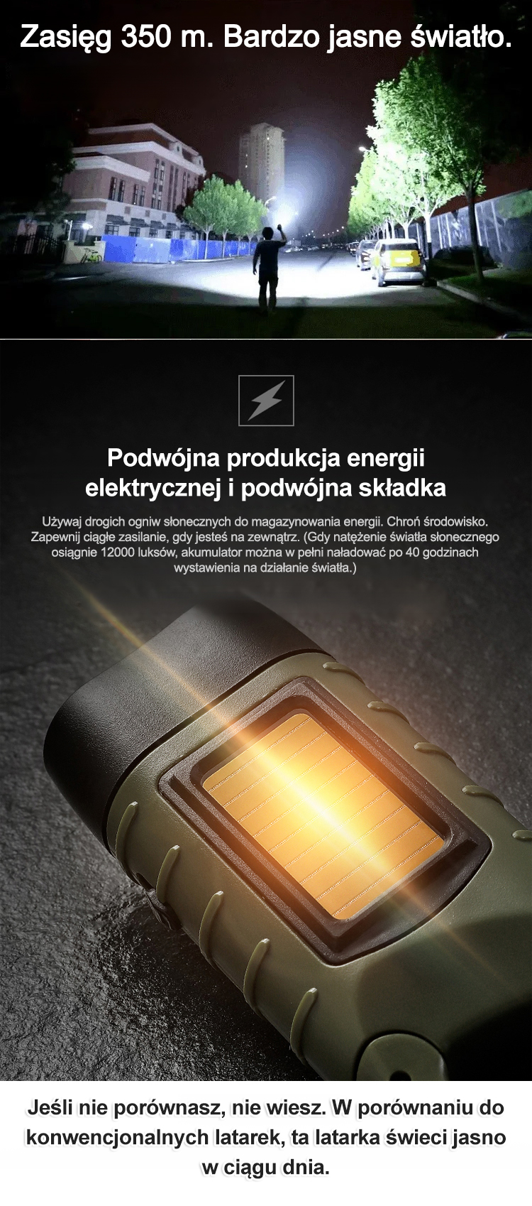 Niezawodna latarka ratunkowa z funkcją powerbanku. Świeci na odległość 500 m i oferuje 3 sposoby ładowania: słońcem, korbą lub kablem. Wykonana z wytrzymałego tworzywa ABS, przetrwa deszcz, mróz i upadki. Niezbędna w każdym domu i plecaku ucieczkowym.