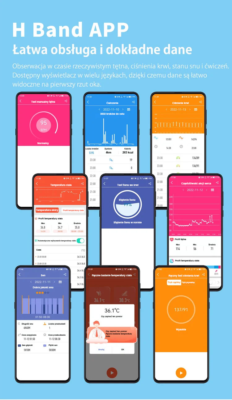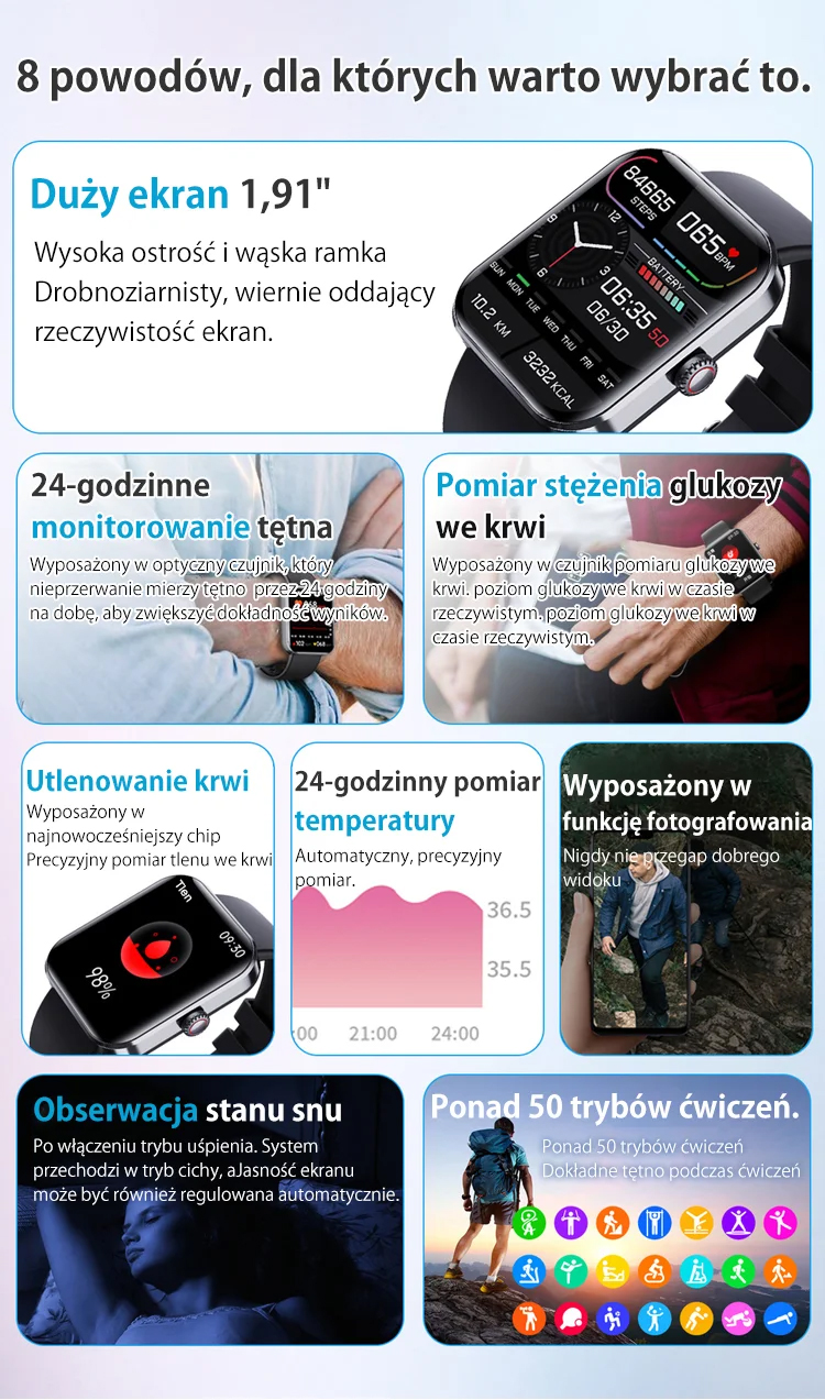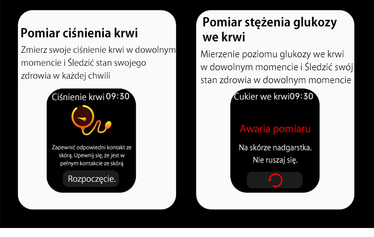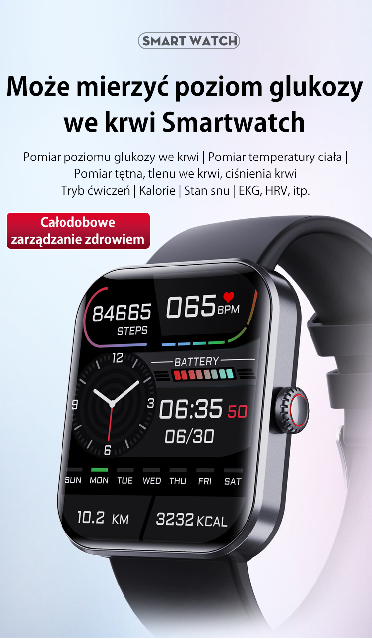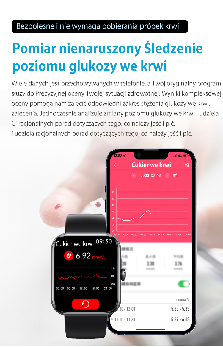 Masz dość wielokrotnego nakłuwania palca każdego dnia? Pożegnaj ból i lęk przed igłami, a także wysokie koszty pasków testowych. Nasz smartwatch nowej generacji na nowo definiuje zarządzanie zdrowiem, oferując Ci całkowicie bezbolesne, ciągłe i monitorowanie poziomu glukozy we krwi w czasie rzeczywistym.